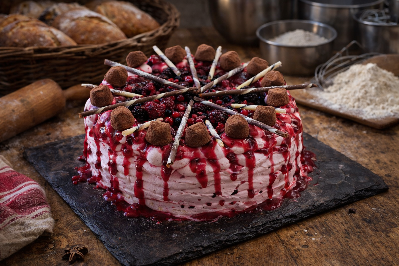 Er nydelig kake som er alles favoritt i selskaper med skogsbærkrem og lag på lag med friske skogsbær. Pyntet med skogsbær og gele på toppen.