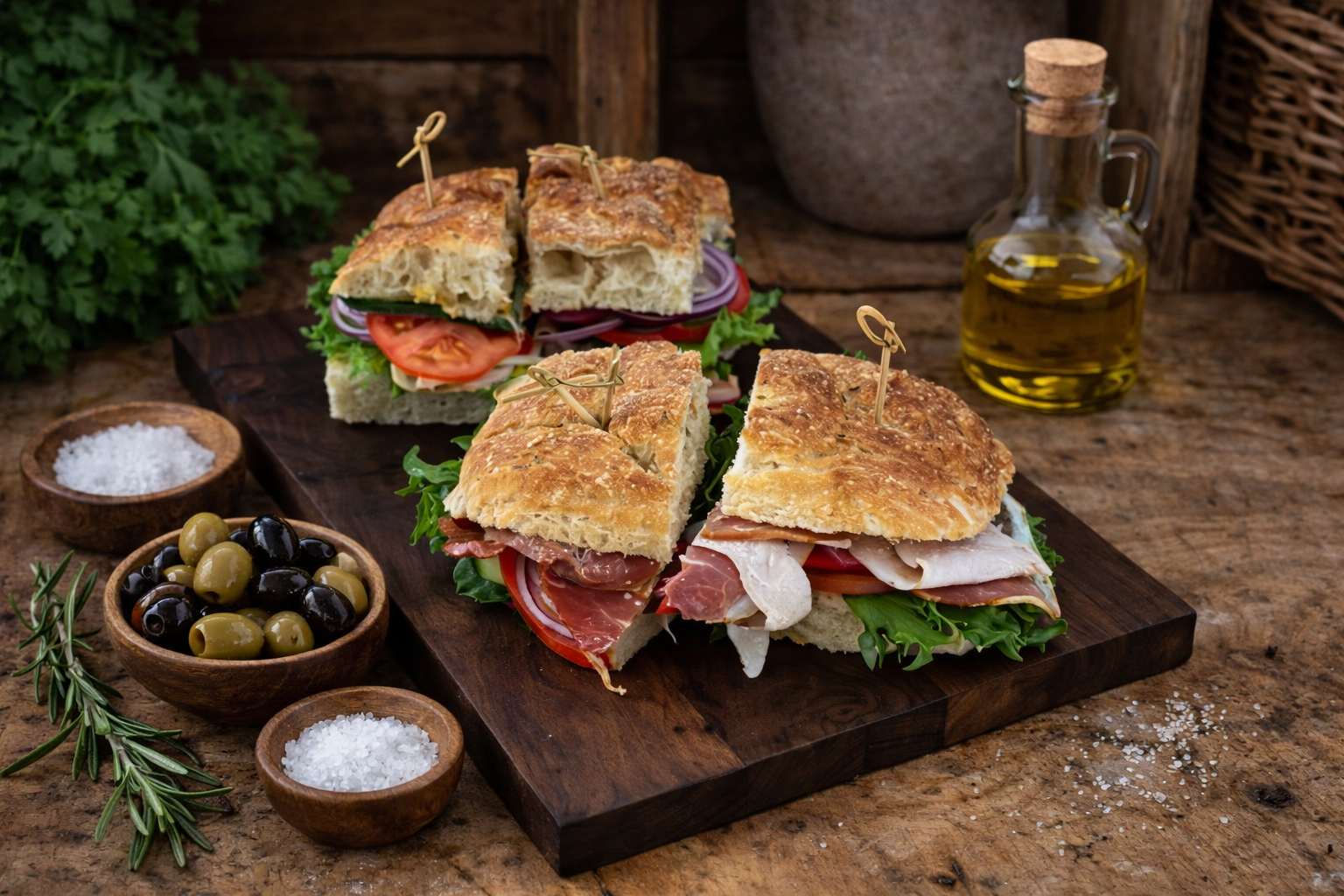 Store høye smørbrød fylt med masse pålegg og raust med frisk salat.